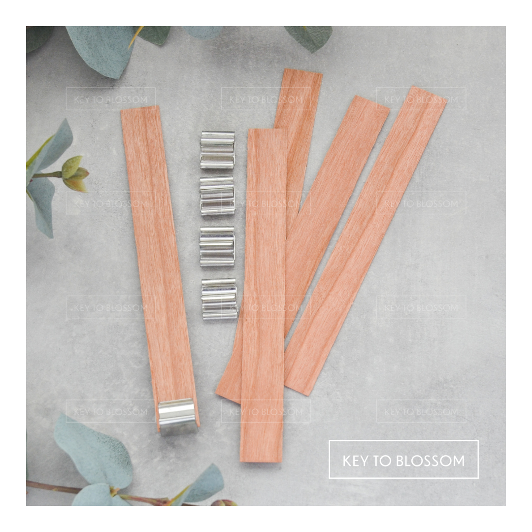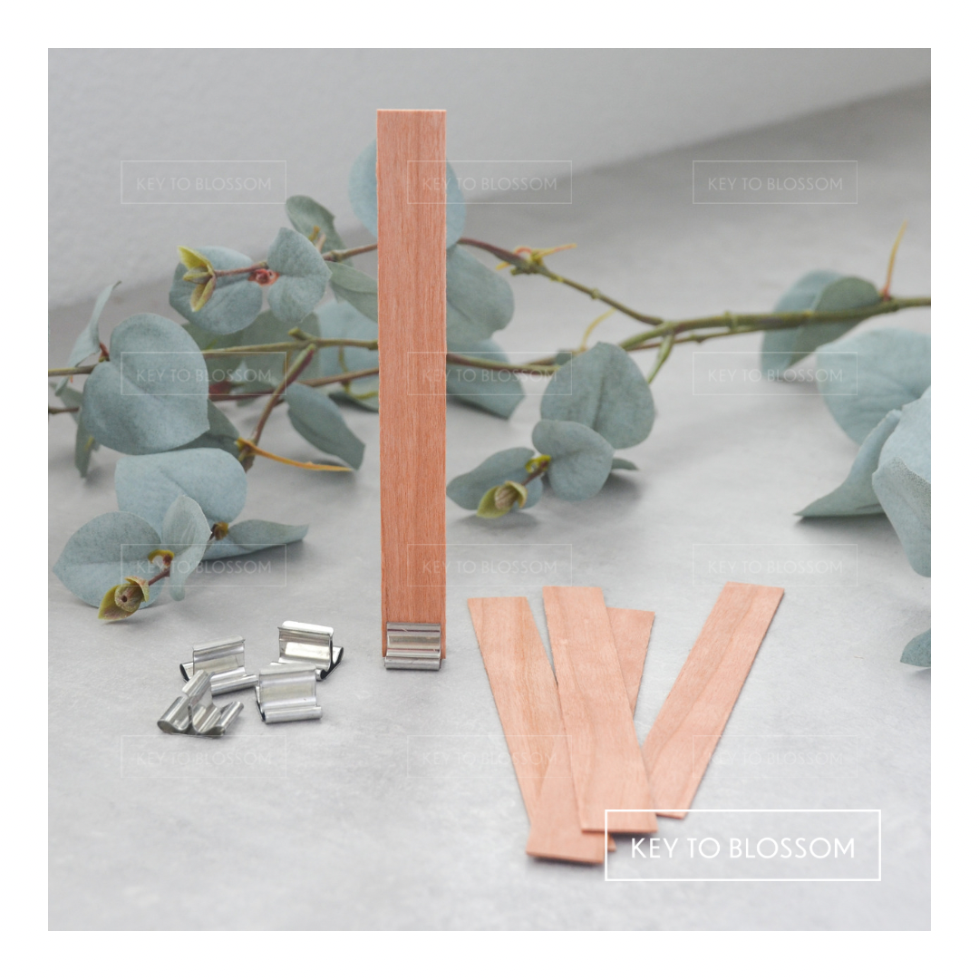 Sie erhalten eine Tüte mit 5 Kerzendochten aus Holz mit einer Länge von 13 cm, inklusive Metallhaltern zur Befestigung.