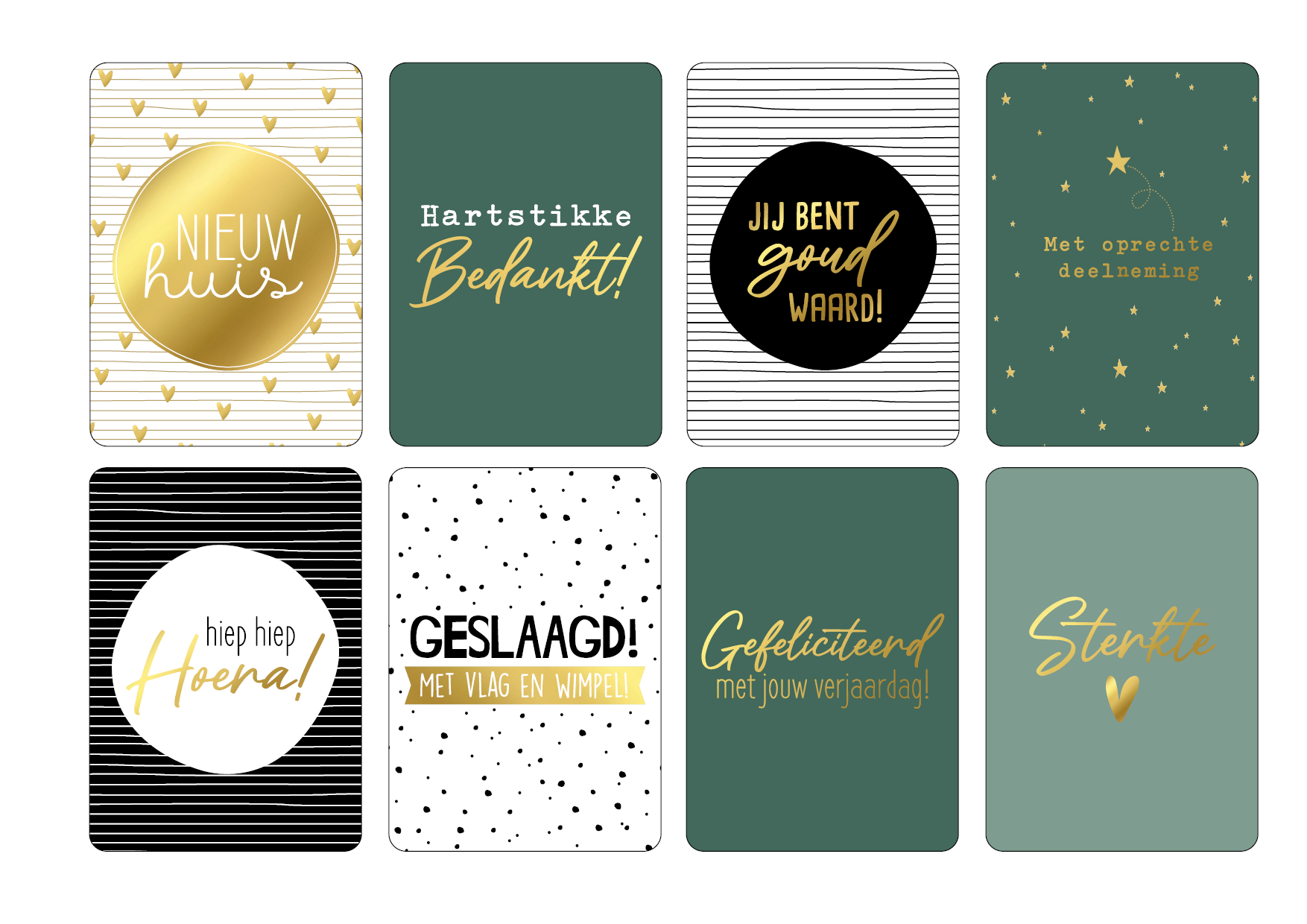 Een verjaardags, geboorte, felicitatie of een kaart om iemand sterkte te wensen. Je hebt al snel een leuke kaart nodig! Met deze duurzame wenskaartenset heb je 8 verschillende designs op voorraad.
